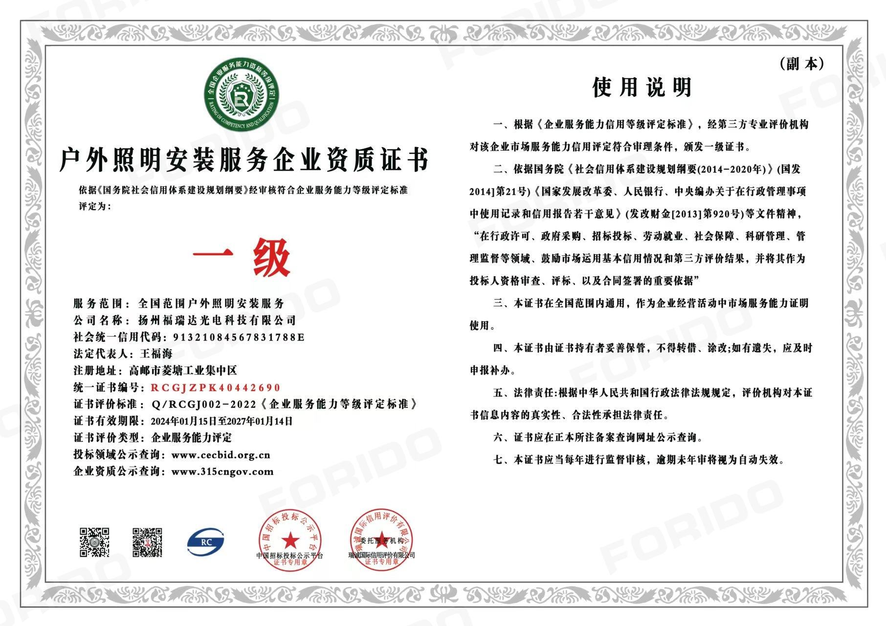 户外照明安装服务企业一级资质证书